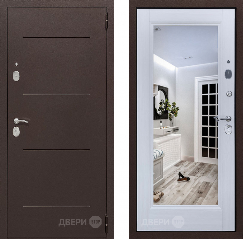 Входная металлическая Дверь Престиж 100 с зеркалом Медь/Лиственница белая 860х2050 мм